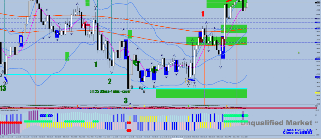 If this was the first trade, F2++ would mean 1.0949 and F3- would mean 1.0967. The plus and the minus both worth 5 pips each.