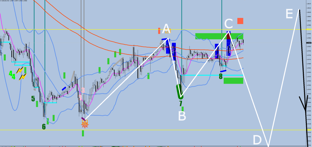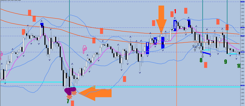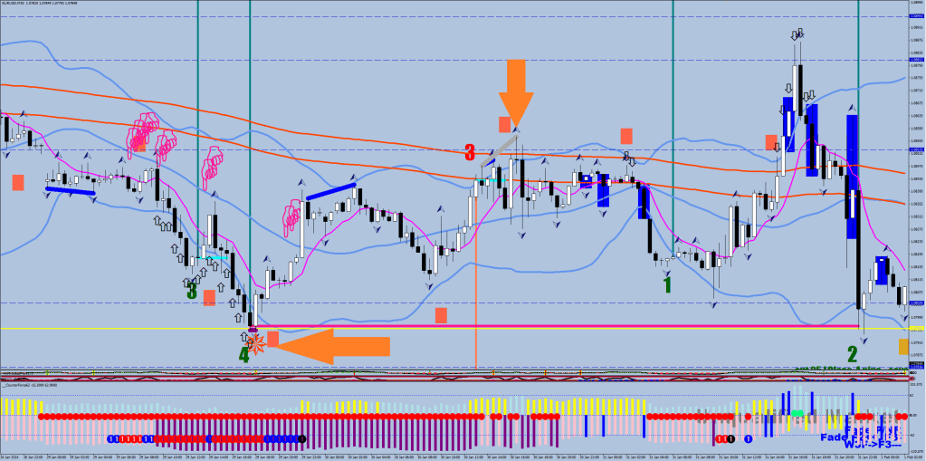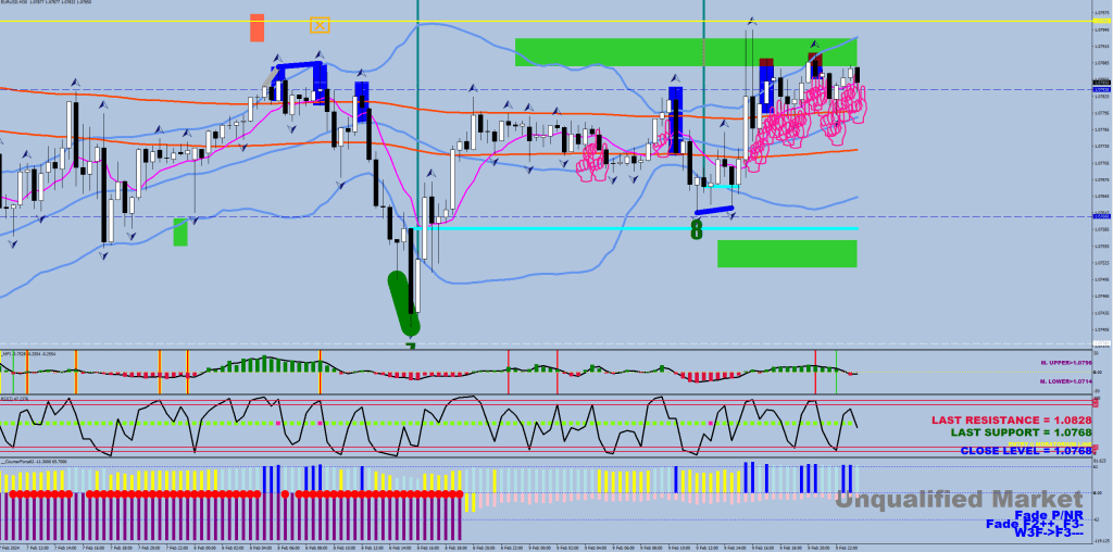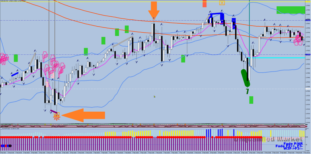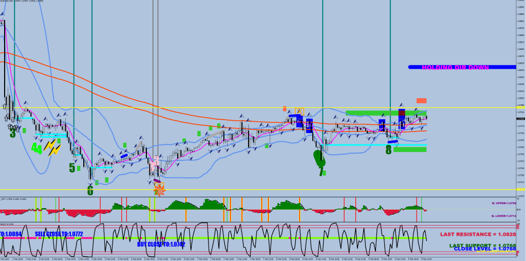 It keeps tracks of regression and progression highs & lows and numbers them figuring resistance and support levels on the way (spells out the last ones in the indicator window #2). In the same indicator window there’s a directional logic print and some action clues, i.e.: Sell Close To 1.0772, Buy Close to 1.0742.