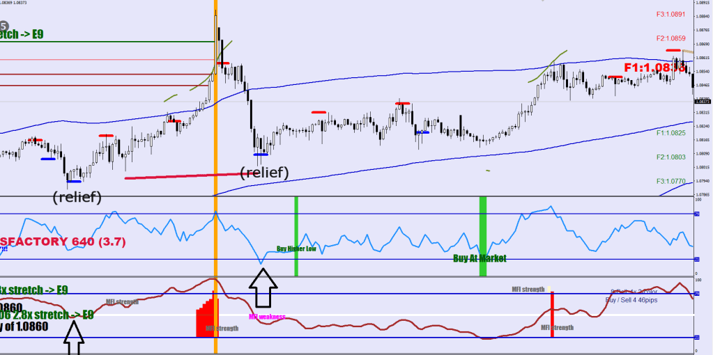 A relief is your 120-sample stochastic returning to the 50 level or your 14-sample MFI hitting an extreme opposite of the trading direction.