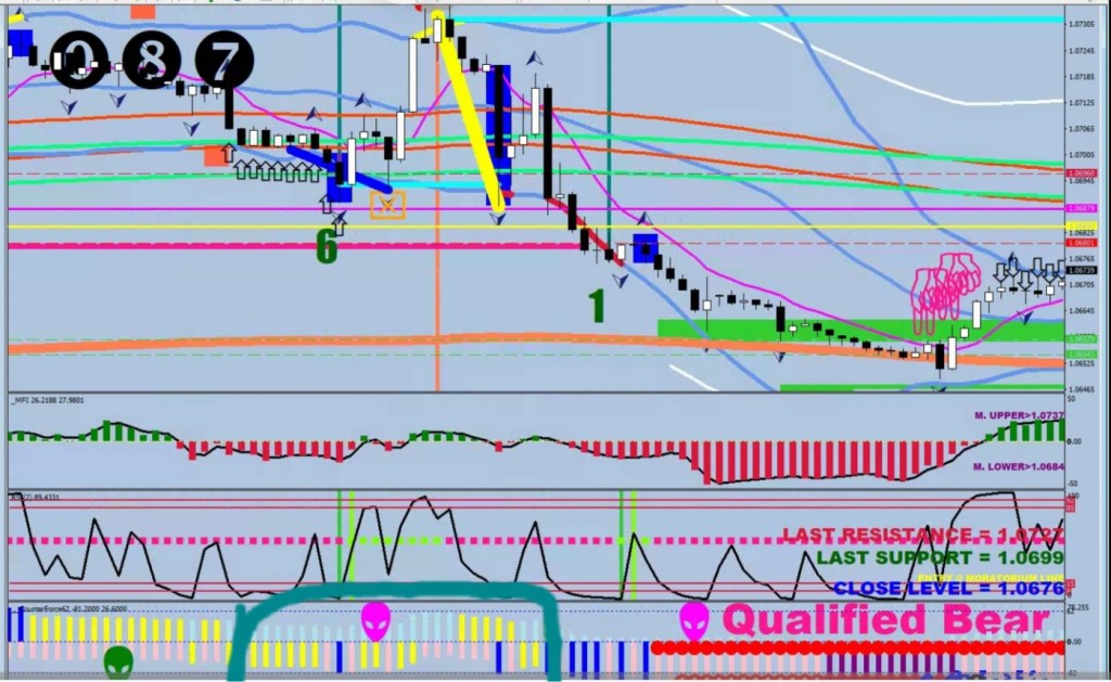 The last P/NR had no hopes to be broken, as the money flow breeze did not privide sufficient lift. The most the market managed was a scare on the shield of the 2.8 Safety Line (magenta highlight). The statistical minimum trip was 1.0648. It got within 1 pip of that.