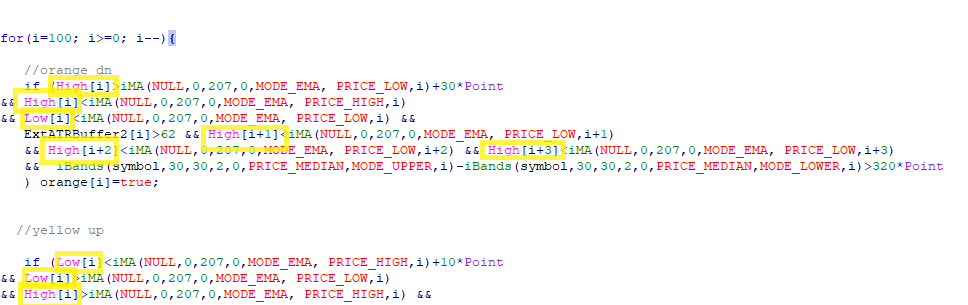 The yellow highlights show timeframe-sensitive data references. These would come back with different values on every timeframe.