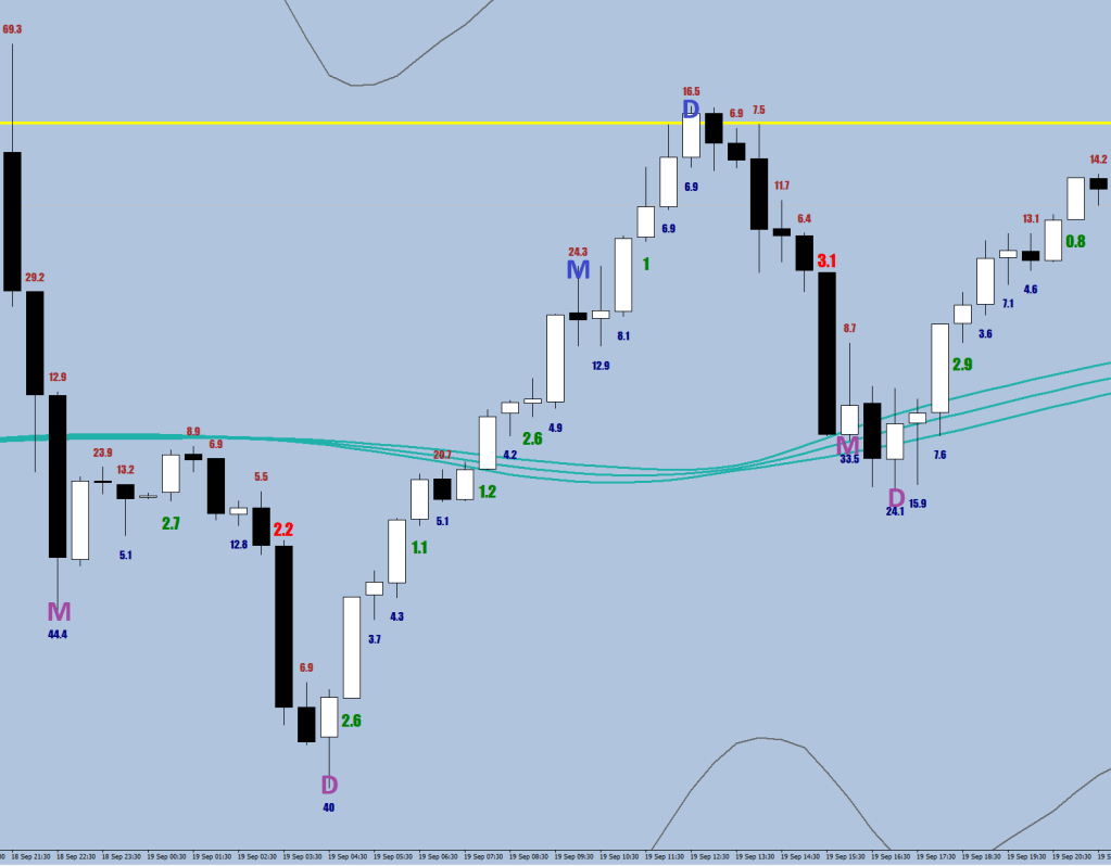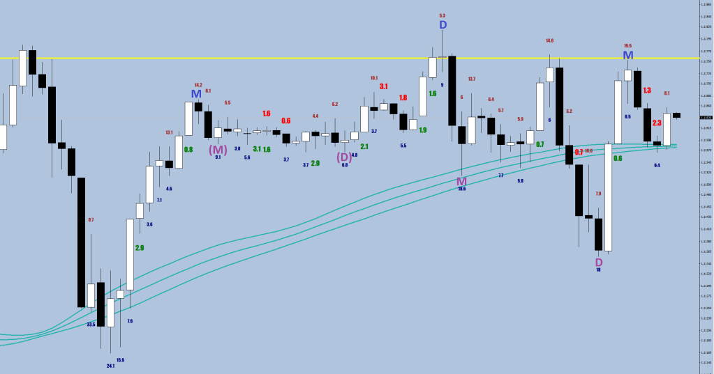 The Measuring leg is where the directional volatility peaks, the Divergent leg is the higher / lower close made with a diverging directional volatility peak.