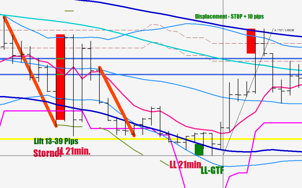Once there was a downside Thrust (pruple), the first le up sould be at least 50pips, most likely would fall short of the 80-pip line, and in an absolute extreme there should be a 45-pip pullback after a 100-pip leg up – meaning that you would at a mimnimum get back the money for anything that was opened 65 pips off the bottom, and the trade is not likely going to go against you more than 15 pips.