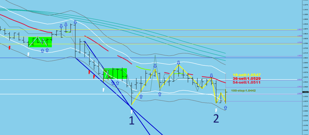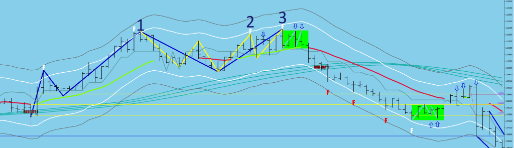 A major top/bottom stats with the proof of a counter-directional volatility. This is a clearly visible ABC move (off #1 – on images 1 and 3). The A would miss the opposite band by 56 pips, the B would miss the band on the side of the F by a little less (say 42, 36 in these examples) and the C would miss the opposite band by even less than A did. The second F is #2 the 3rd F print requires another ABC move, but way smaller in amplitude. Nevertheless, the size is such that it should take a minimum of 3 days to print with the B falling shy of the F, and the C2 falling shy of the “A2” (a contracting pattern), then #3 would be the undercut of both 1 and 2.