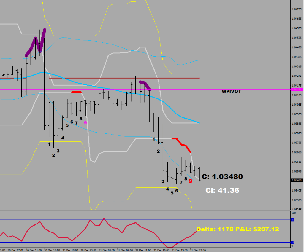 With extra abundant volatility (Election night) there are two lifelines to be had. The 30-sample BB and the 8 EMO. Once these two were utilized, the reaction from the BB was a mere 43 pips, and the next entry was a bona fide rally.