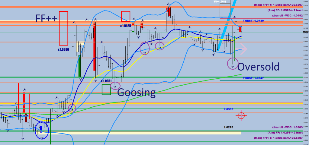 Now, with the mindset of market makers reacting and squaring, the initiating moves had to be made by non-MM players. The purple fractals seem to have one thing in common: they utilize those market maker lines that were long squaring prints (coral-colored lines) and they hold their palms out 4-12 pips lower. The traders seem to ignore the green, short squaring lines.