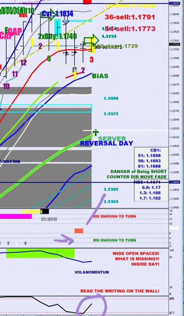 There were three thrusts (green) which meant a time out, but the bounce taking a day plus already has achieved nothing on the upside. The last leg’s first established level was bought at 1.1690, but there was an absolute stall out at the 100-pip stop.