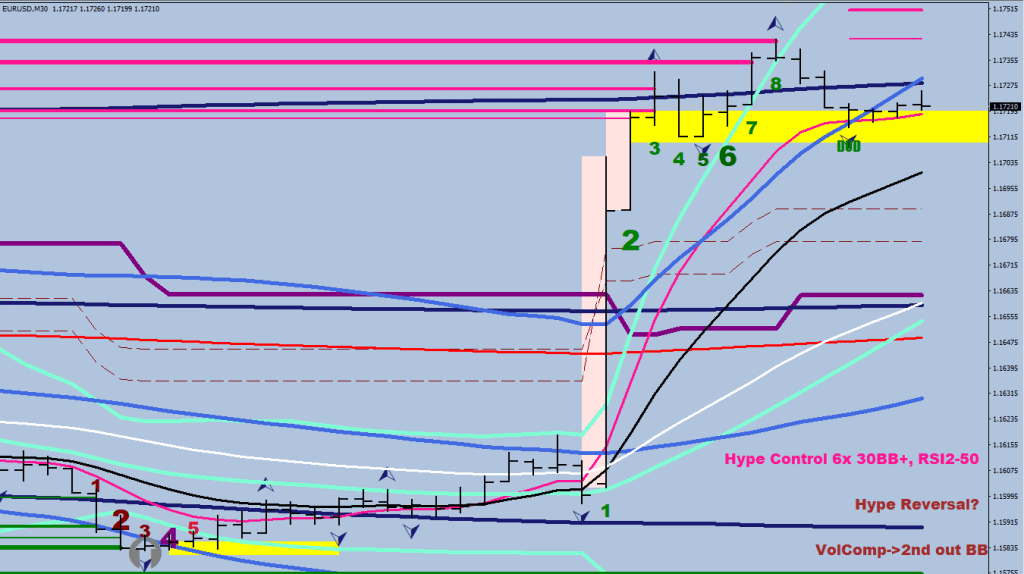 Getting everyone wrong-footed is certainly a possibility here from taking the price from the 100-sample delayed 2 STDV 120 BB’s low to its high in 2 hours. 1.1736 is the 1st established level, it could serve as resistance.