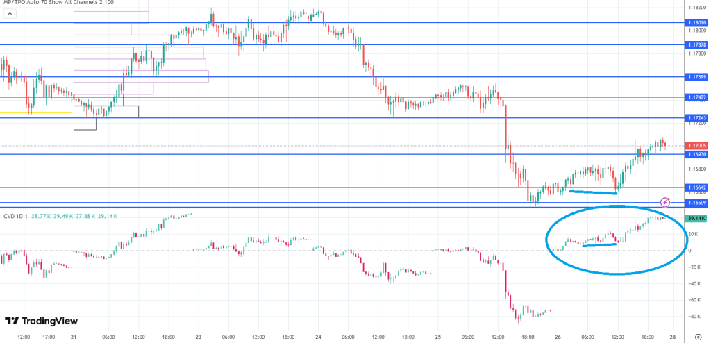 Looking at the Cumulative Volume Delta, you can see that Friday was a strong up day, buying from the start to the end, almost on the high.
