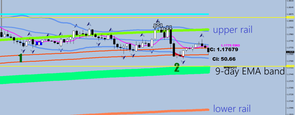I also added a plot I call “end of tract”, for when the market is stuck between the upper and the lower guard rails. This zone +-45 around the 9=day EMA is pretty much neutral. I sometimes refer to this zone as neutral.