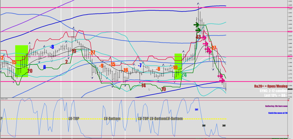 The two green boxes are coming off an RSI2 reading below 6.4and have achieved 20 or more pips for an open (measuring leg, Most important #2) az a second option, I included a Bollinger Squeeze below 30 pips. The direction of the wind is to be factored in, of course.