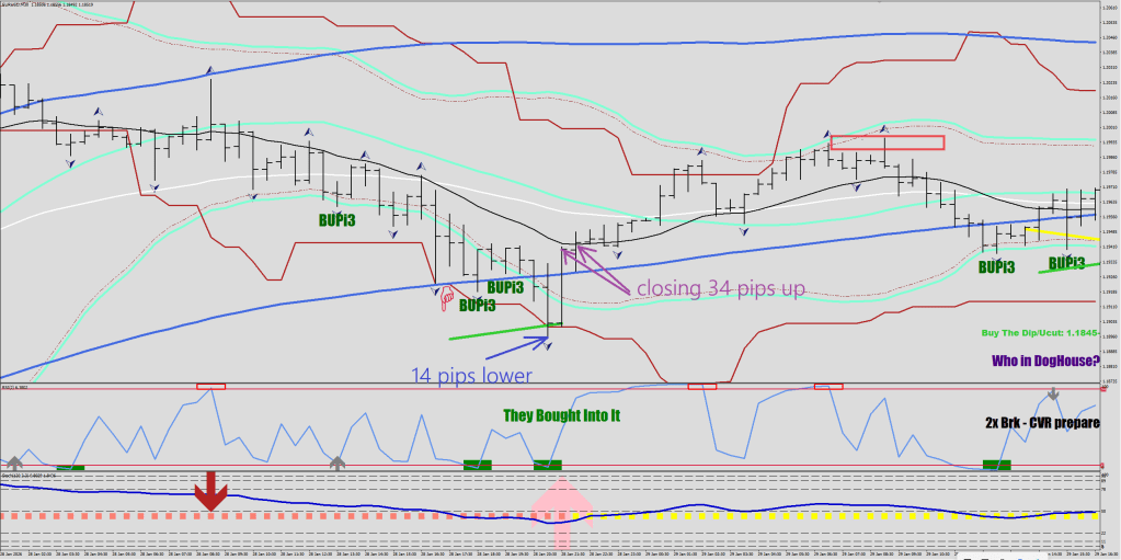 Once you see a candle beyond this Firebrick line, add 14 pips to the previous candle, and then the next 2 candles would be falling shy of this new extreme by 34 pips, you have yourself a “sold into / bought into.” There is an escalated version of achieving 27 more pips beyond the Firebrick to receive a volatility boost (Luke, I’m your father). This would make the directional logic paint the opposite color instantly, versus neutral.