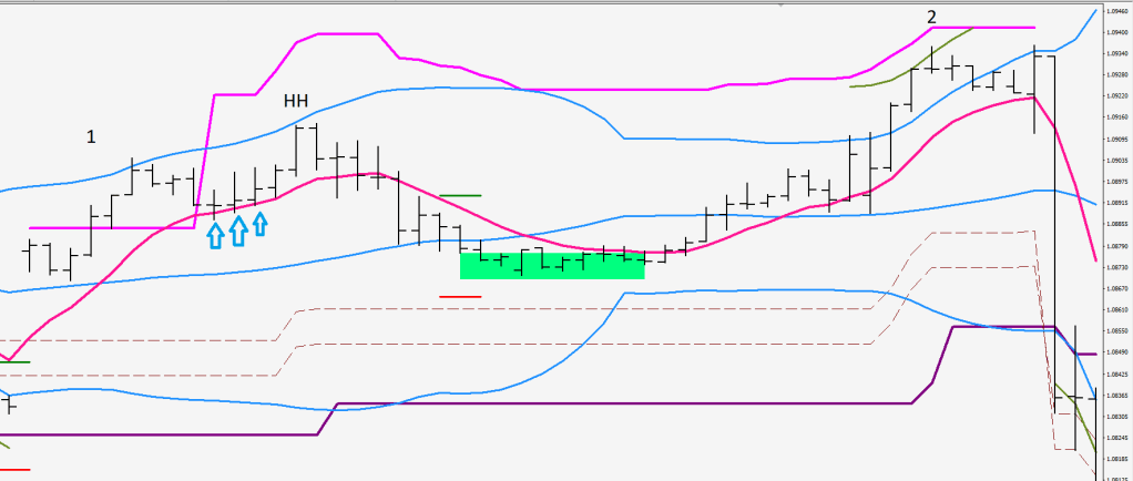 After the LL print the Tendering phase is over, and you get a deeper pullback typically beyond the S-30 (middle Bollinger) during extreme volatility the LH pullback would fall shy of the 80-pip line (purple).