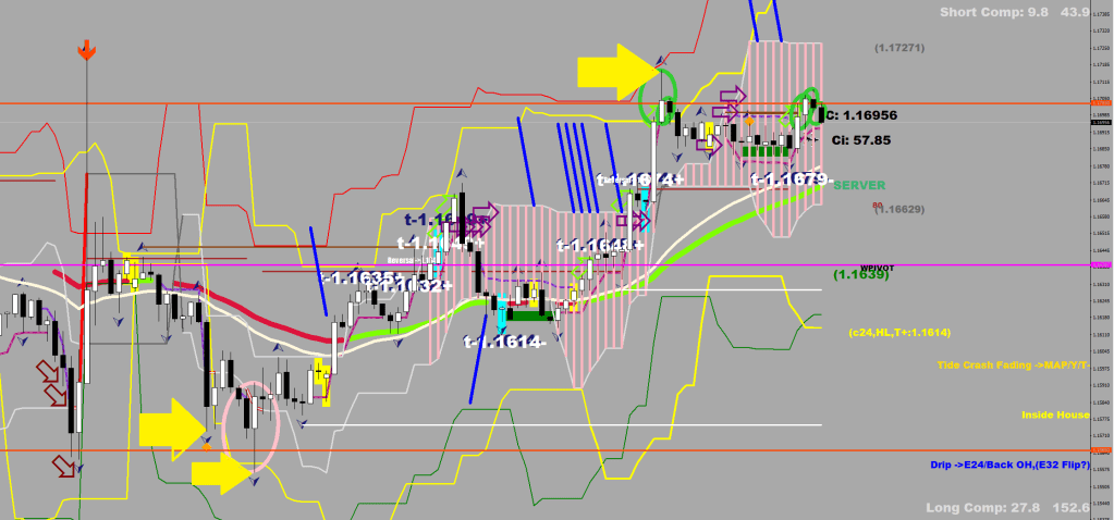 The tide turn signals are not useful in a mapping market. The green and pink hoops are turns occurring about 1 fluctuation maximum away from the 9-day EMA (“the valley”). The blue marker lines are trade suggestions for a 16, 35, 55-pip break, either because of the flip at the E-32 (Khaki) or at the edge of the house (Pink shading).