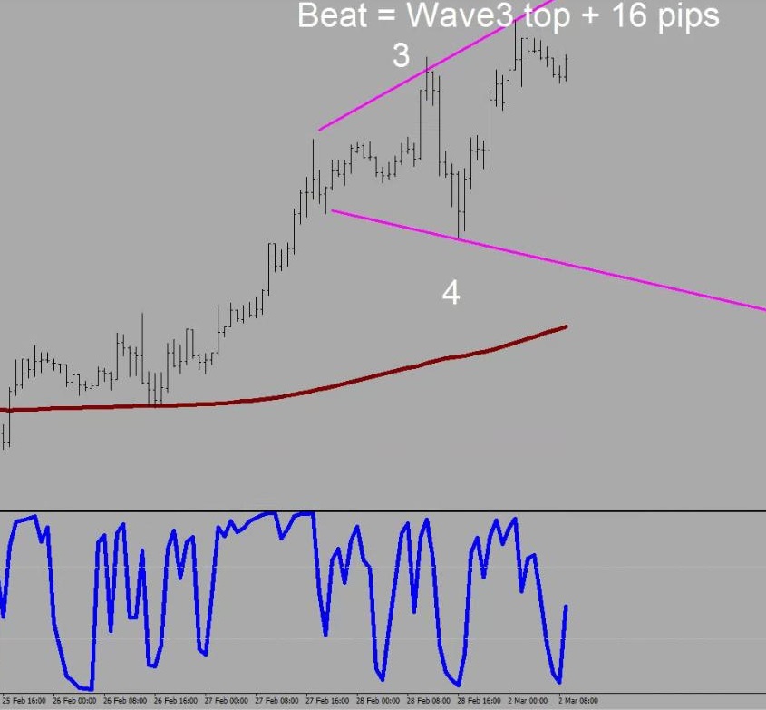 So, when you see a Wave 4 print with the lower low on RSI, you know what is about to happen, and have an approximate expectation of where price is likely to fail moving any further.Picture the 3 above the last swing high and add 16 pips.