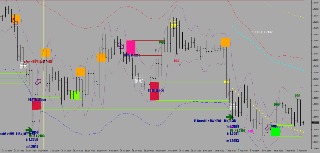 On the image above to find support and resistance zones automatically, my software utilizes the breach of the dotted brackets, which are 10-pip displacements. I also invented a logical switch for “fresh green pop / fresh red pop” to find the most relevant ones.