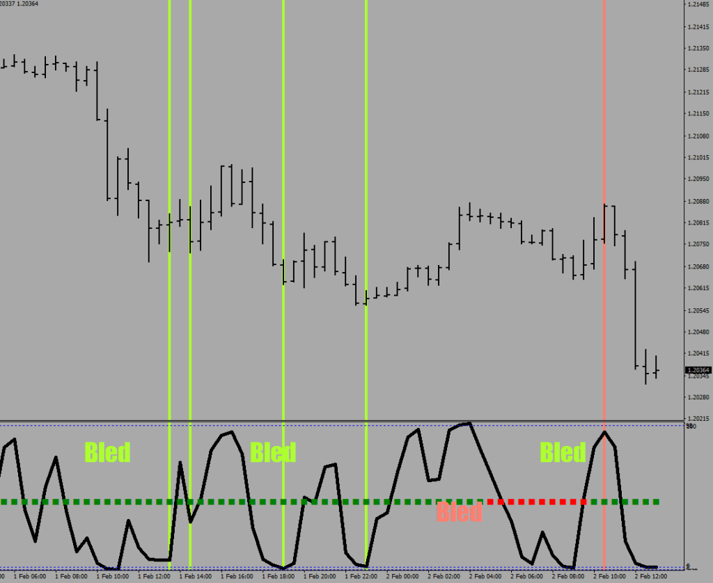 The vertical line determines a point in time when the divergence took place if the next 30 minutes starts with absolutely no kick back / recoil. These lines get a magenta accent to draw attention to the urgency: you have to go in in the opposite direction at market ASAP. “El Desperato” stands for a desperate action, and similarly on the receiving end the turn would likely come with a sense of urgency.
