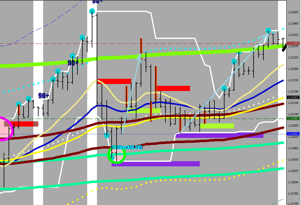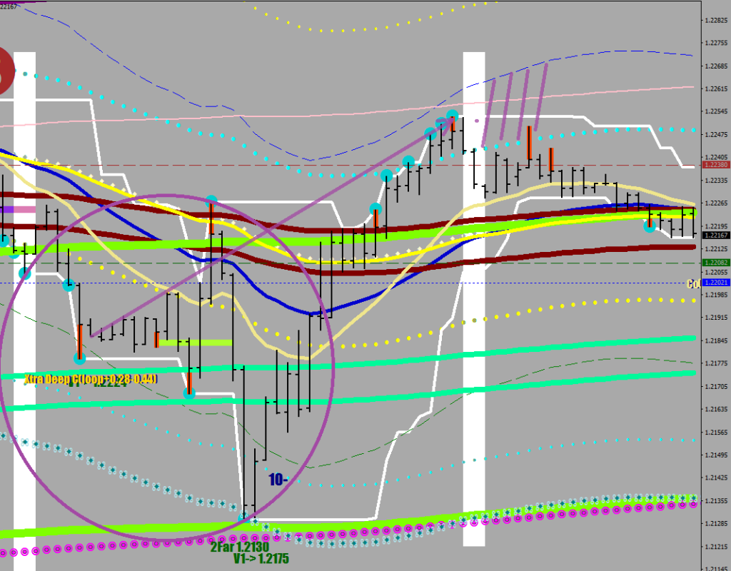 How does getting in after two downside Pops sound? Optimal. The purple dotted bands? 10-pip displacements of the previous hour’s lows and highs.